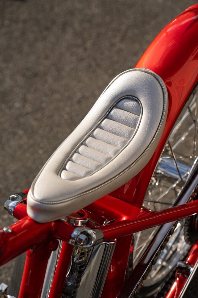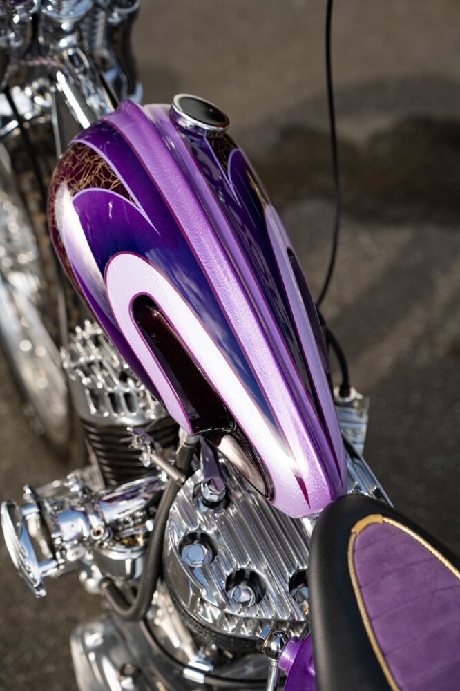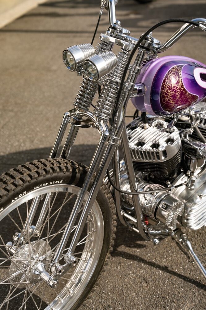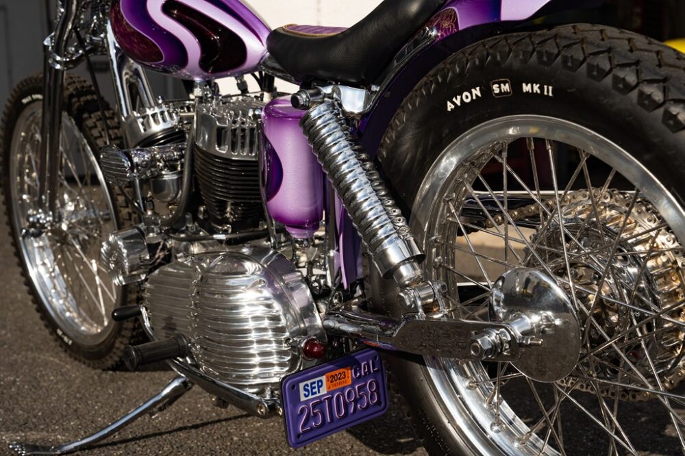 2022年のビルダーズピック1位に輝いたのは日本でも馴染みの深いDavid Polgreenが製作したシャイニーな56年KHK。クロームメッキで仕上げた純正モディファイのスイングアームフレームと、Harpoonによるパープル基調のカスタムペイントが落とし込まれたワンオフのエクステリアが美しいコントラストを演出。