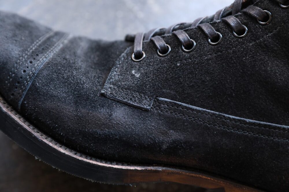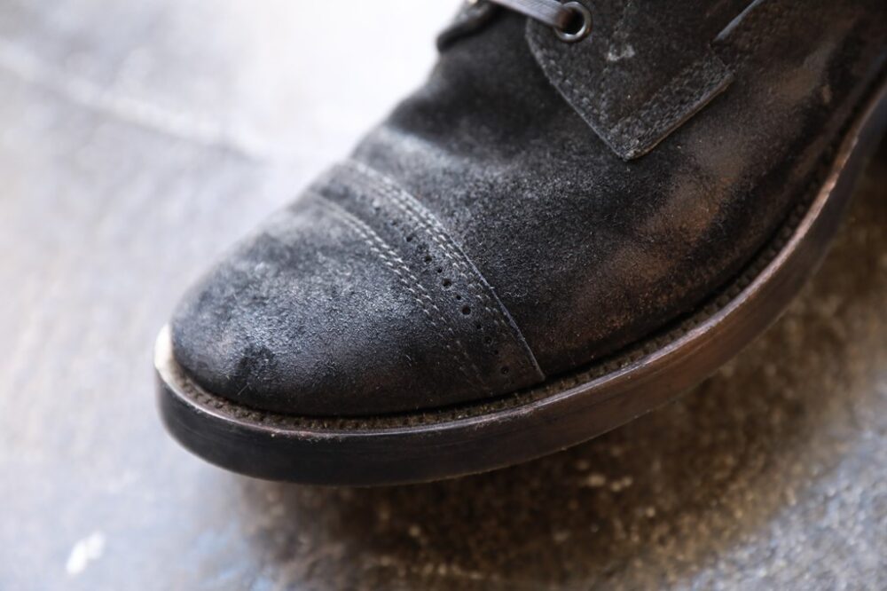つま先はキャップトゥを採用。ワックス加工されたスウェードは履くと毛羽立つ部分と、毛足が寝る部分のコントラストが経年変化として表れてくる。