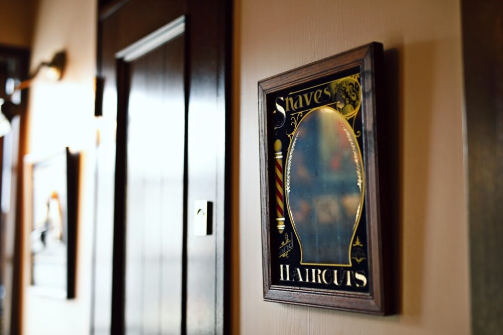 バーバーチェアの正面にある鏡が、この店作りのきっかけとなったマントルミラー。1920年代頃に英国で作られたもので、暖炉の上に設置されていた。この年代らしいデコラティブな装飾だ。