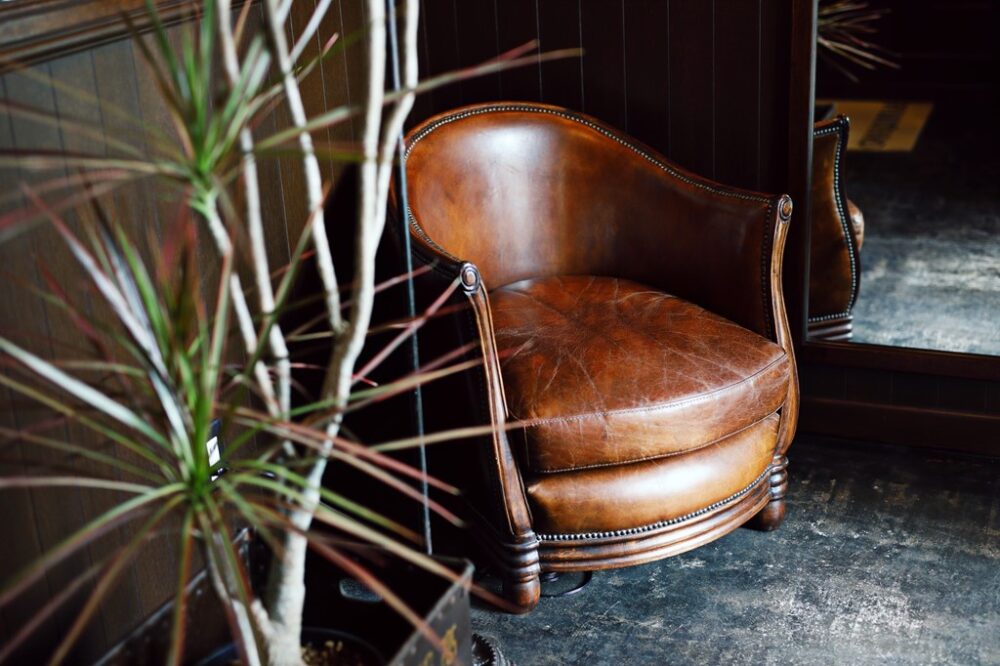 入り口の待合スペースには、英国の伝統的な チェスターフィールドソファ。ヴィンテージで探したが、小ぶりなサイズが見つからなかったので、日本の現行品をチョイスした。