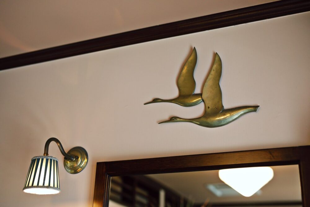 真鍮を使った鳥モチーフのアンティーク小物も洒落が効いている。よく見るとランプにも真鍮が使われており、うまくマッチしている。白すぎない壁のトーンも洒落ている。