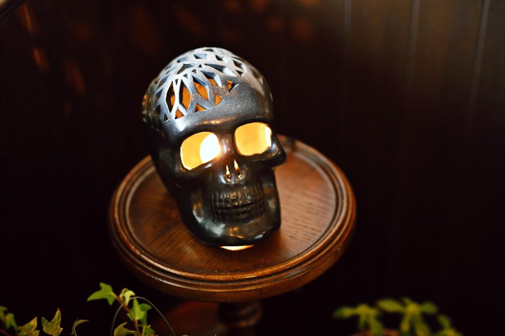 クラシックな空間に中に、突如現れるスカルモチーフのランプ。旧いものではないが、実に洒落の効いたチョイス。置いてある木製のインテリアも全体の雰囲気にマッチしている。