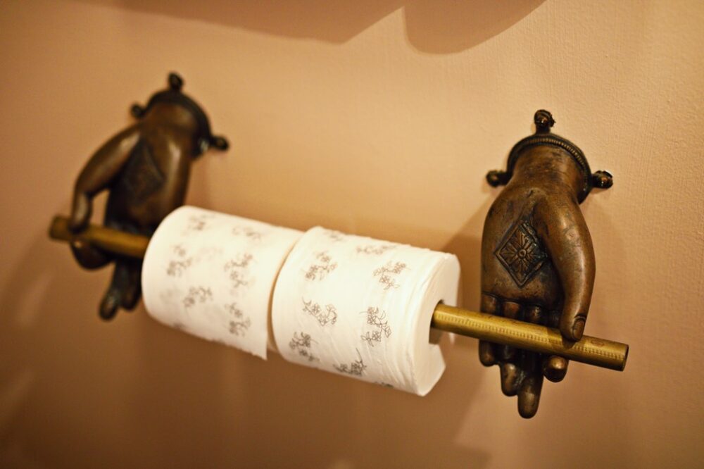 レストルームにも抜かりなし。アンティークの真鍮製のバーにトイレットペーパーを組み合わせたアイデアがお見事。手のモチーフはタオルハンガーと予想。