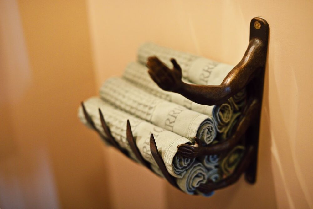 レストルーム内にあるタオル置きもまたトイレットペーパーの台と同じく手をモチーフにしたもので統一。こまめにインテリアをチェックする會田氏らしいチョイスだ。