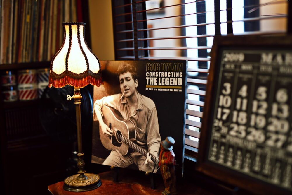 カット中は、お客さんの好みに合わせて、音楽をセレクトする。レコードとCDが用意されており、流しているジャケットはこの位置に飾られる。ランプのチョイスも絶妙である。