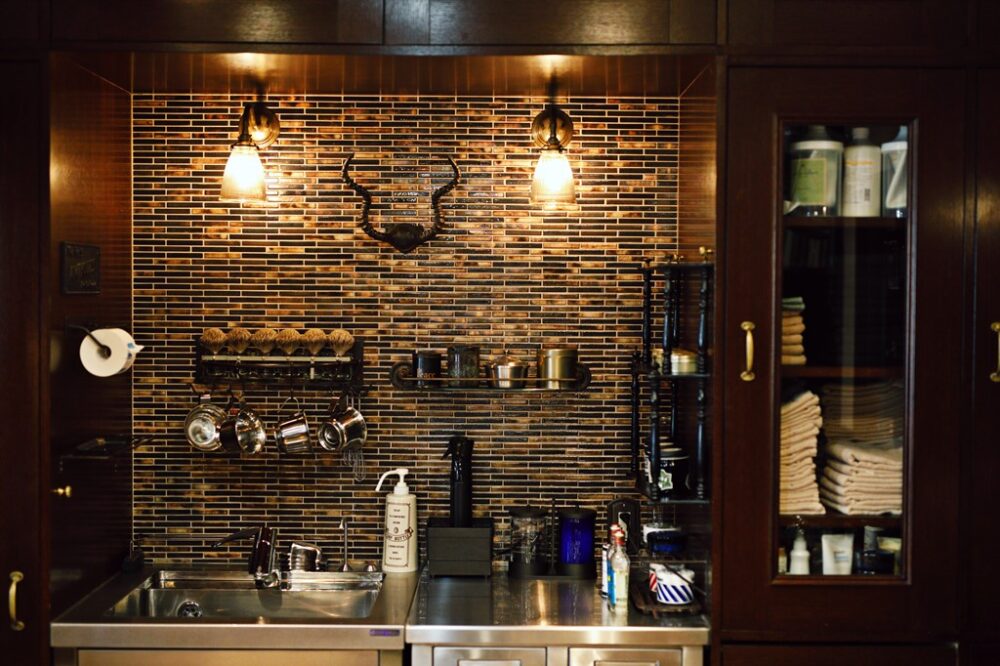 当初から旧きよき時代のバーバーをイメージしたわけではないとオーナーの會田マコトさんは語る。このようなクラシックな空間になったきっかけは、バーバーチェアの前にある1920年代に作られた英国のマントルミラー。たまたまインテリアショップで見つけたこのミラーが似合う空間にしたいと思い、今のようなインテリアになったそう。