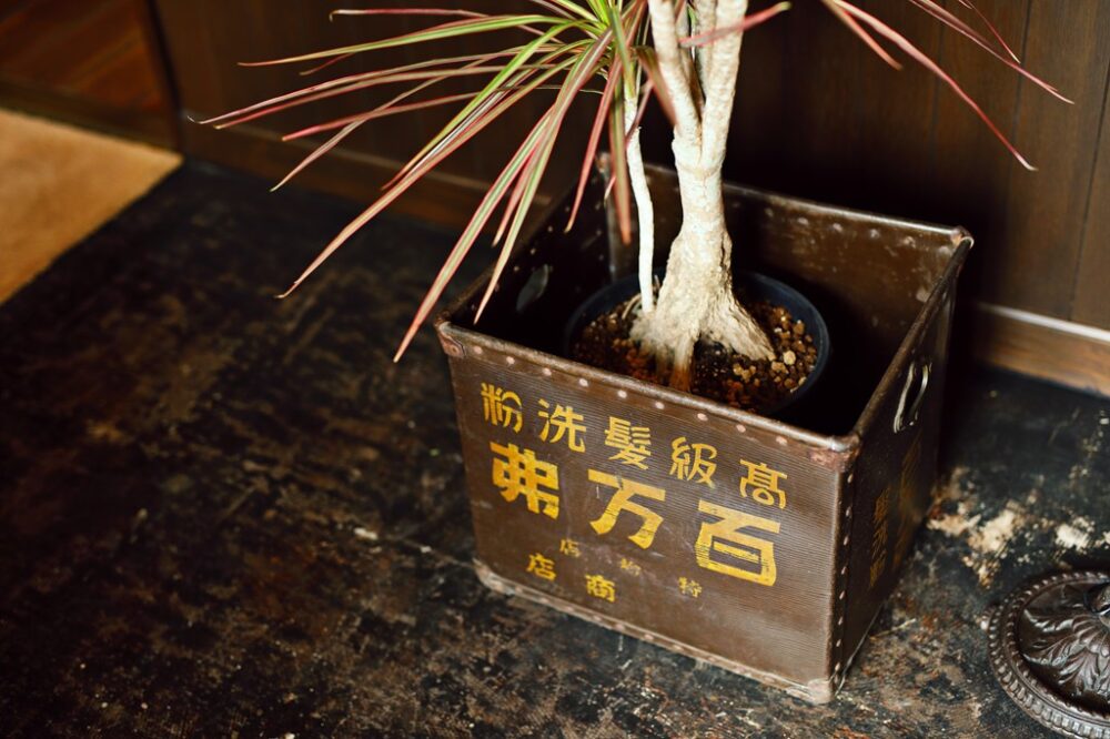 よく見ると昭和のアドバタイジングものを使っているのもおもしろい。高級髪洗粉と書いてあるボックスは、そのまま使うのではなく、鉢カバーとしてアレンジしている。