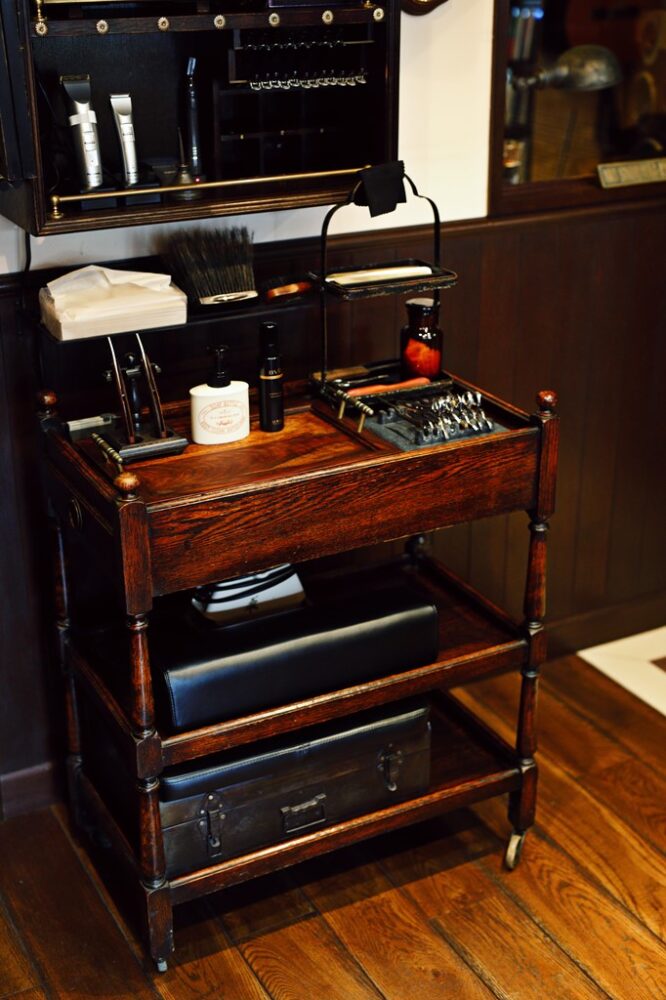 バリカンやハサミを置いているワゴンは、マントルミラーと同年代と思われるヨーロッパのヴィンテージ。英国の家具でよく見られるデコラティブな意匠が随所に施されている。