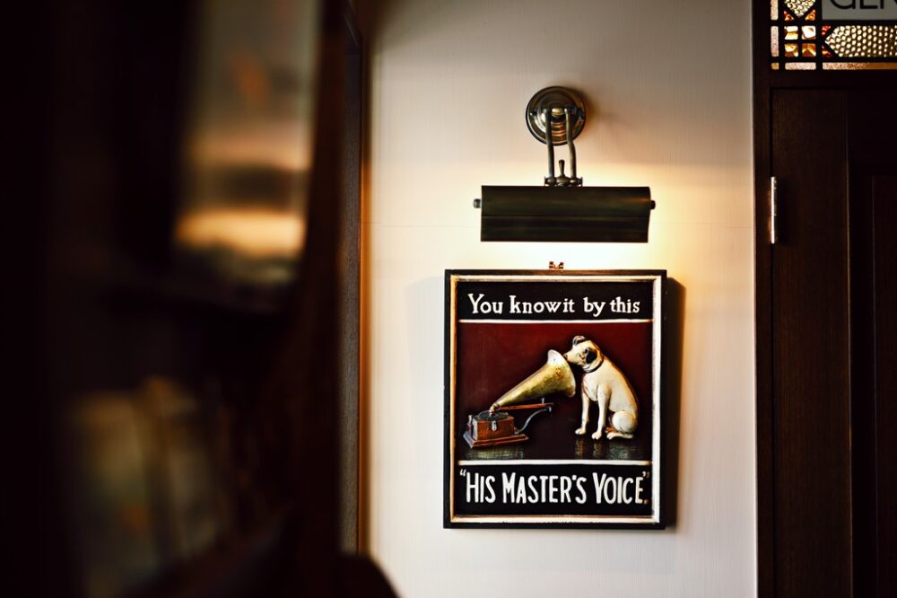 インダストリアルライトの下には、英国の画家フランシス・バラウドの作品で、日本VICTORのロゴ にもなったニッパー犬のアートワークが。このセンスは参考になる。