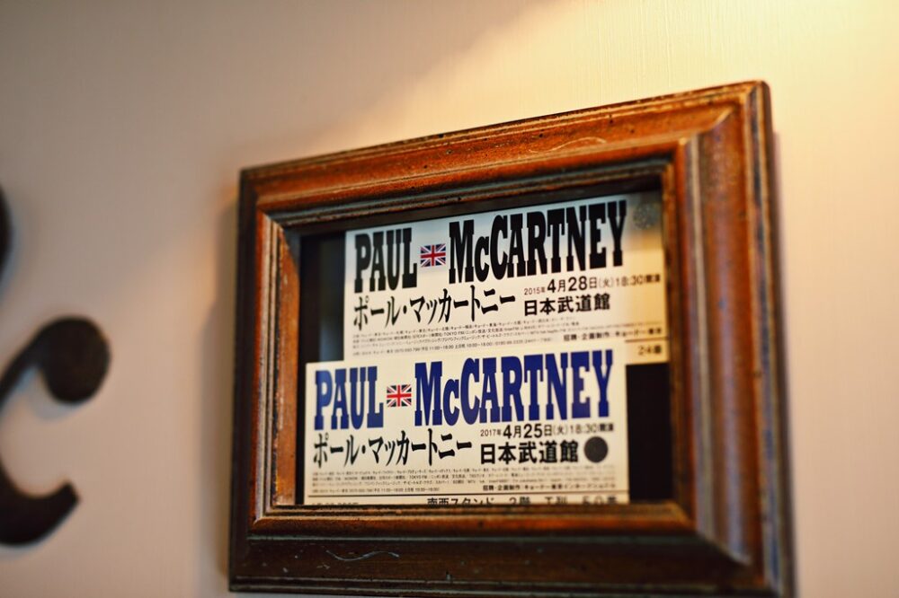 音楽好きでもあるオーナーの會田氏が行ったポール・マッカトニーの日本公演のチケットをアンティークのフレームで額装。チケットを並べるだけで絵になるのがおもしろい。
