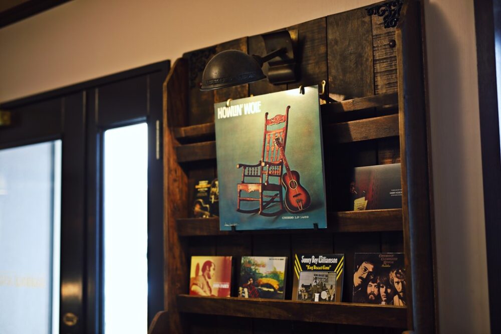 お客さんがよりリラックスできるように、1980年代のJBLの名機を事前に用意していたので、美しく収まるようにオリジナルの什器を設計した。空間に合ったインテリアを置くのではなく、インテリアに合わせた空間を作る。この様式美がこのような美しい調和を実現させた。
