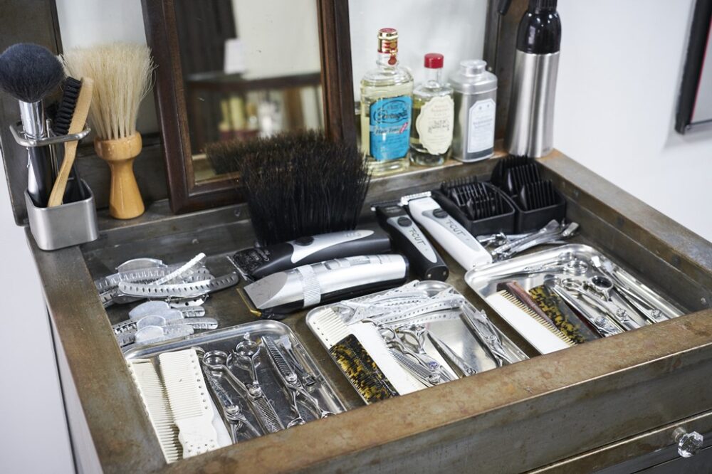 ハサミやバリカン、ブラシなどがきれいに整頓されて置かれるヴィンテージのキャビネット。ここにはオーナーの樋口氏を含め3名の理容師の道具が収納されている。