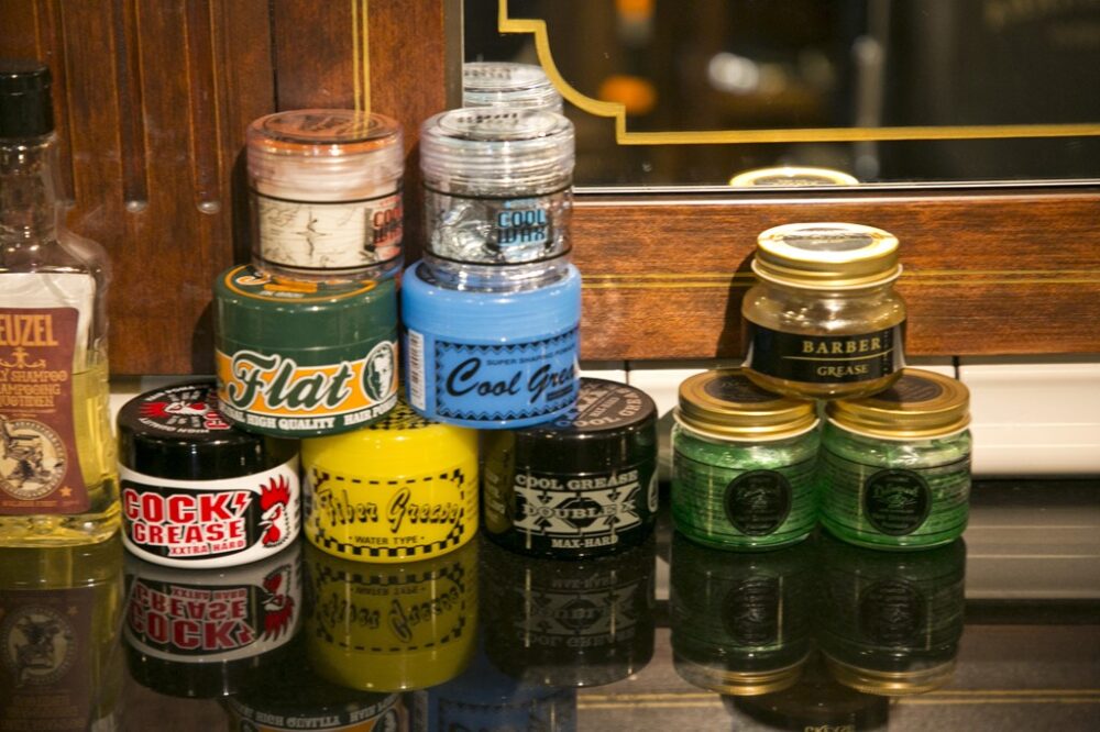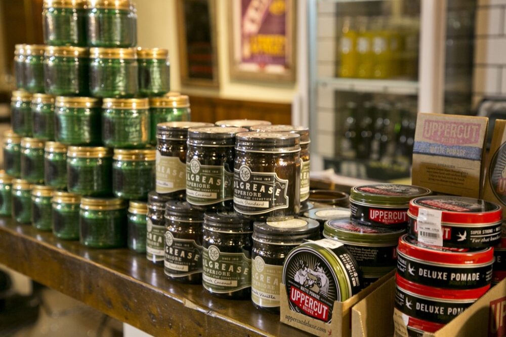 エントランス部にあるバーカウンターの上にはUPPERCUT DELU XE、COOLGREASE SUPERIORのグリース(手前)のほか、BARBA TOKYOがプロデュースするオリジナルグリースの販売も行う。