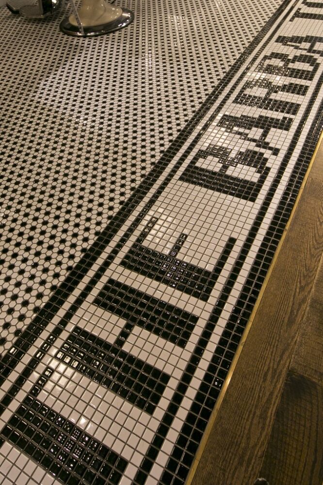 何の変哲も無いビルを降りてくと、入り口からゴールドリーフをあしらったゴージャスなサインボードがお出迎え。扉を開ければ、カウンターバーを配し、味のある木を基調としたエントランス部分と、その奥にはアメリカから取り寄せたというサブウェイタイルを敷き詰めたサロンスペースが広がっている。