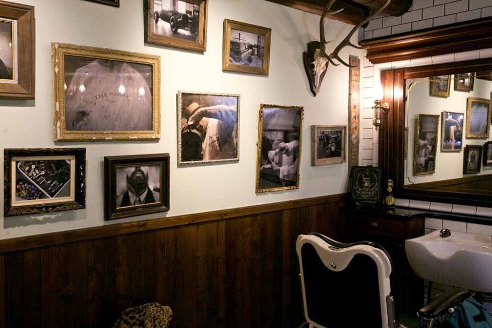 壁には海外のバーバーのカット風景のほか、ヴィンテージのクルマやバイクなどオーナーの好みの世界観を表す写真が多数。額縁もアンティークのものが使用されている。