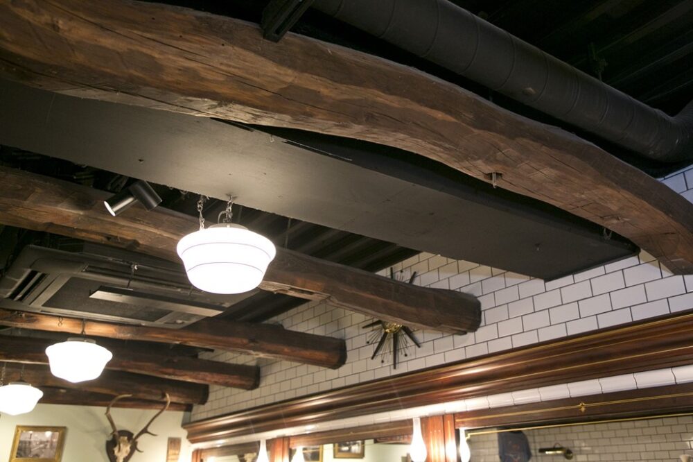 天井の露出した鉄骨やエアコンも店の雰囲気に合わせて黒に塗り直されている。木の梁はオーナーの出身地でもある北海道から古材を取り寄せるなど、郷土に対する感謝の気持ちを込めている。