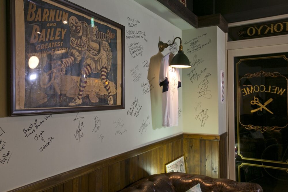 入り口付近の壁にはこれまでに噂を聞きつけて来店した外国のアーティストやシルクドソレイユ、ラグビーの日本代表選手、外国のバーバーのオーナーなどサインが描かれている。