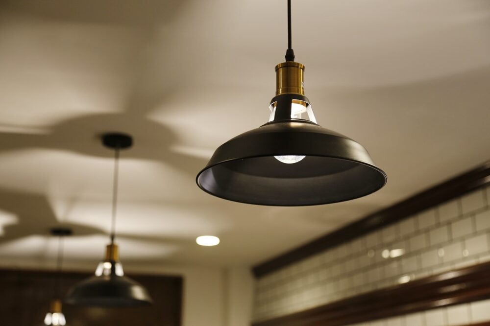 このインダストリアルスタイルのランプは、上部にも穴が空いた現行品。夜になると上部から漏れた光が天井を照らす。