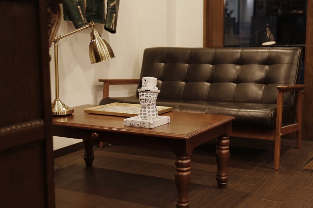 こちらは待合スペース。デコラティブな脚が際立つアンティークのテーブルの上には、真鍮製のインダストリアルランプや、NEIGHBORHOODとPeanuts&Coのお香立てがある。