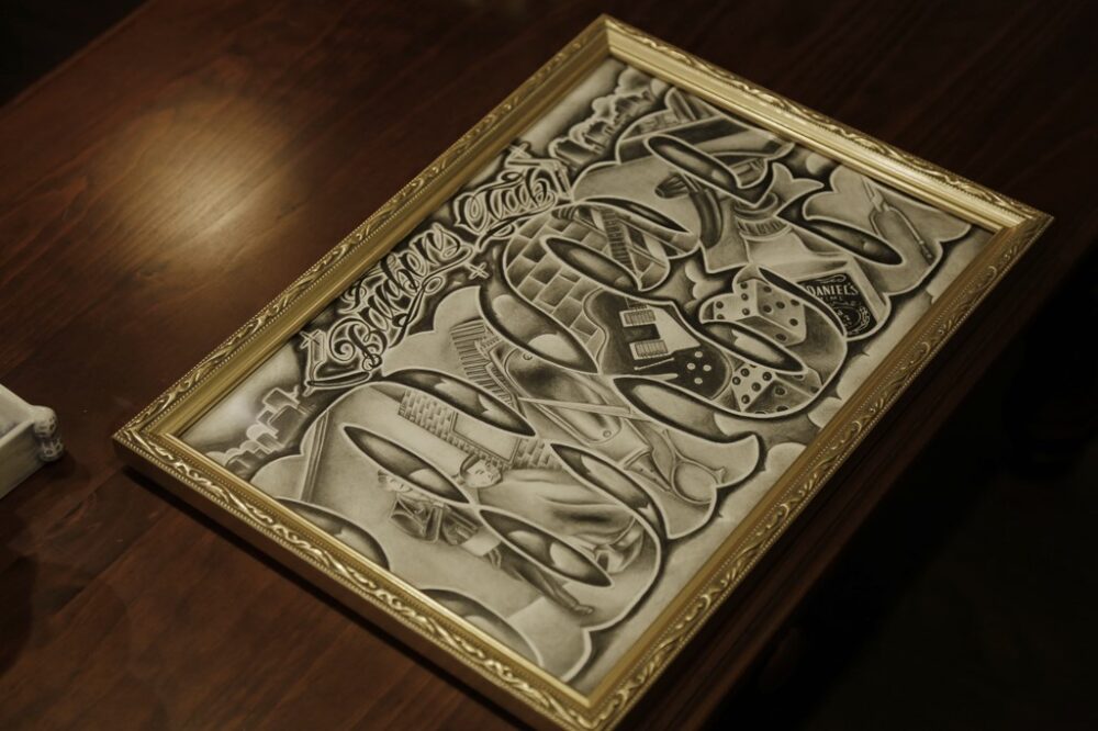 待合スペースの机の上には、知人のタトゥーアーティスト ウエストン氏に描いてもらったというアートワークが。真鍮製のフレームにすることでより重厚感ある仕上がりになっている。
