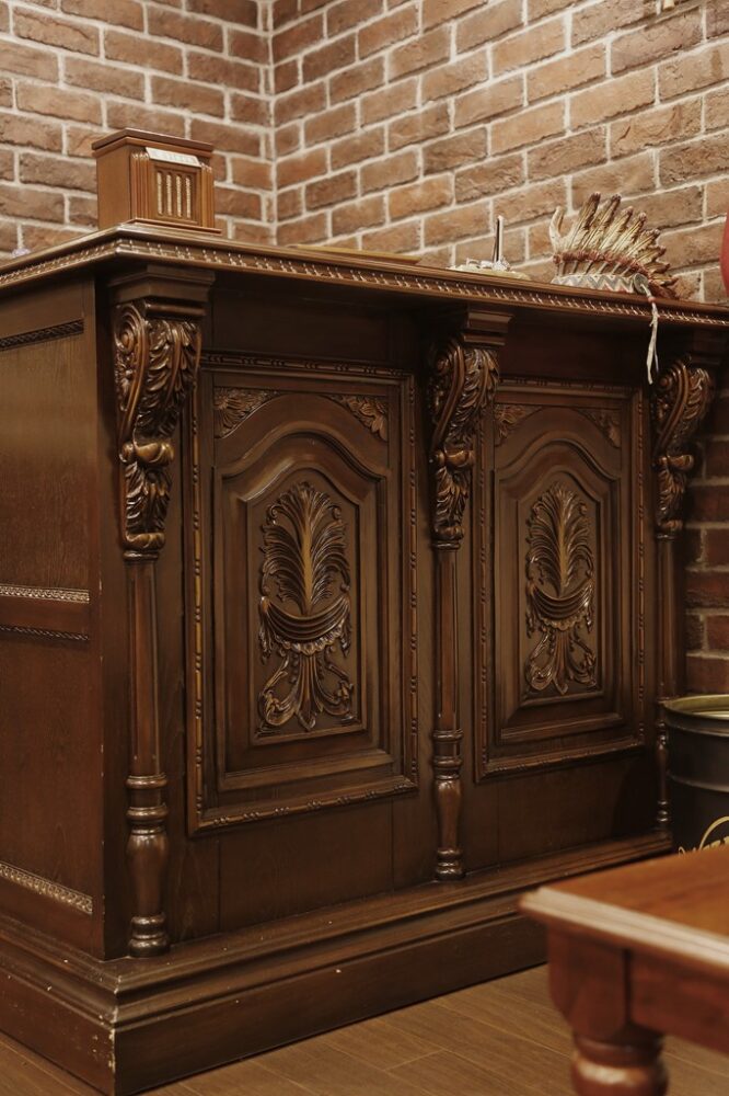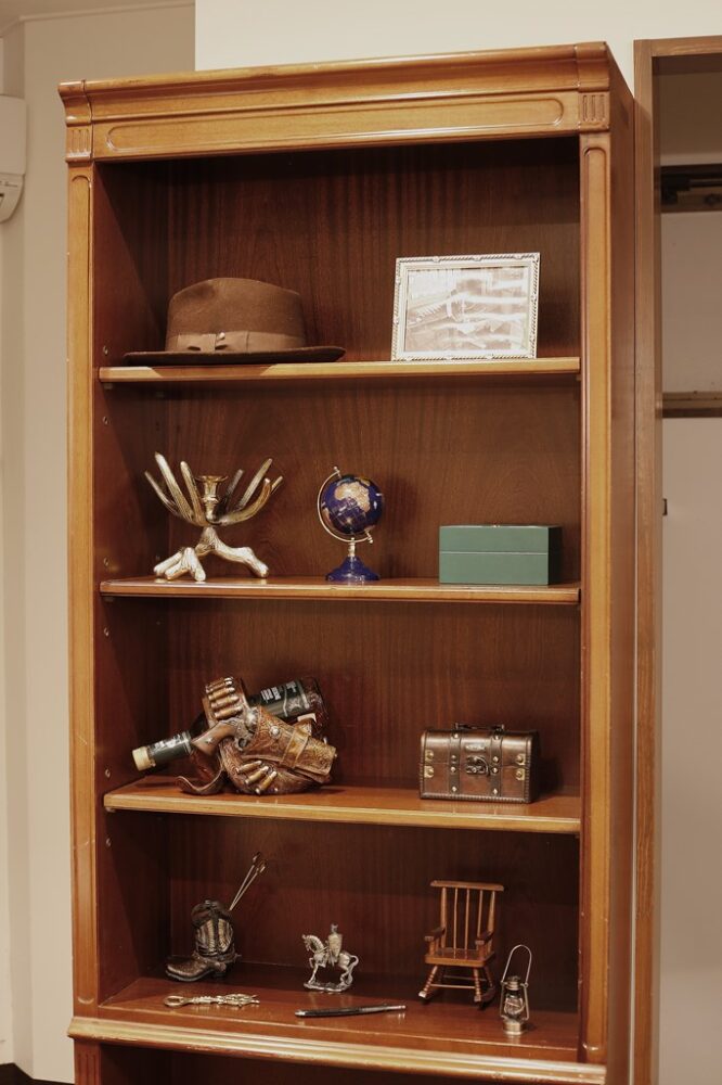 各部にさり気ない装飾が施されたウッド製のシェルフには、米本氏が買い集めてきたアンティークの小物からROLEXまでディスプレイ。氏の趣味が伝わってくる。