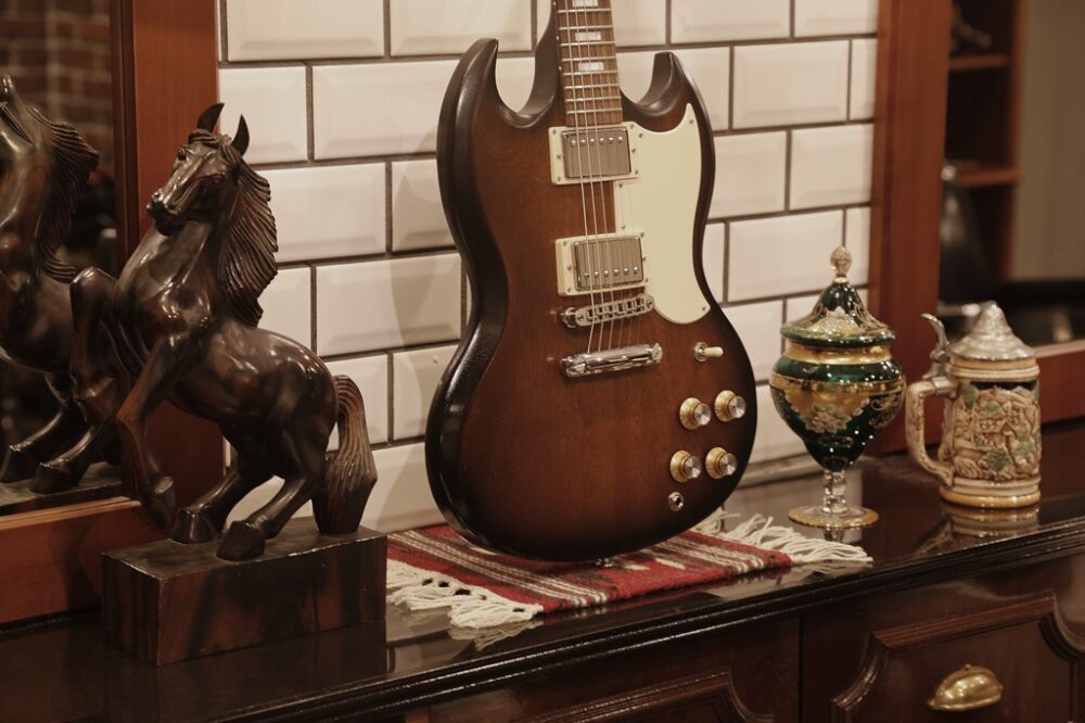 よく見るとGibson SGの下にはチマヨのブランケットがアクセントに使われている。他にもヨーロッパの装飾的なガラスなど、独特なミックス感も見事である。