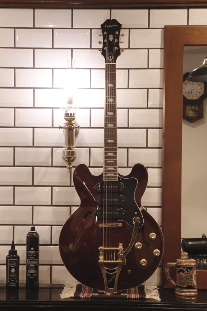 旧きよき時代の雰囲気に大の音楽好きオーナーの私物ギターなど現代的な感性がなじむ。