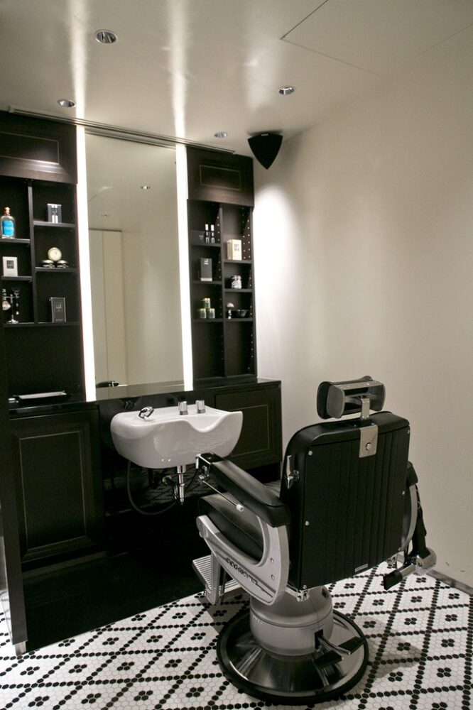 壁面の道具を収納するキャビネットや洗面台の高さや並び方など一部に、スタッフの意向が取り入れられているが、基本的には内装から置かれている小物類に至るまで、ダンヒルイズムが注入されている。