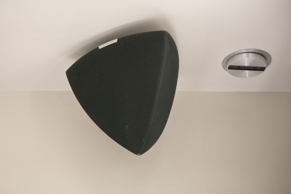 スピーカーはハイエンドのオーディオ製品を展開するBANG&OLUFSEN。店内全て同じスピーカーで、BGMもdunhillオリジナルミックス。シーズンごとに変わる。