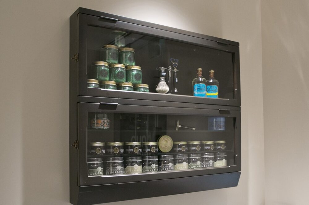 カウンターの後ろにはポマードなど販売用の品が並べられたキャビネットが設置される。フック部分にもアンティークの部材が使われるなど細部にまでこだわっている。