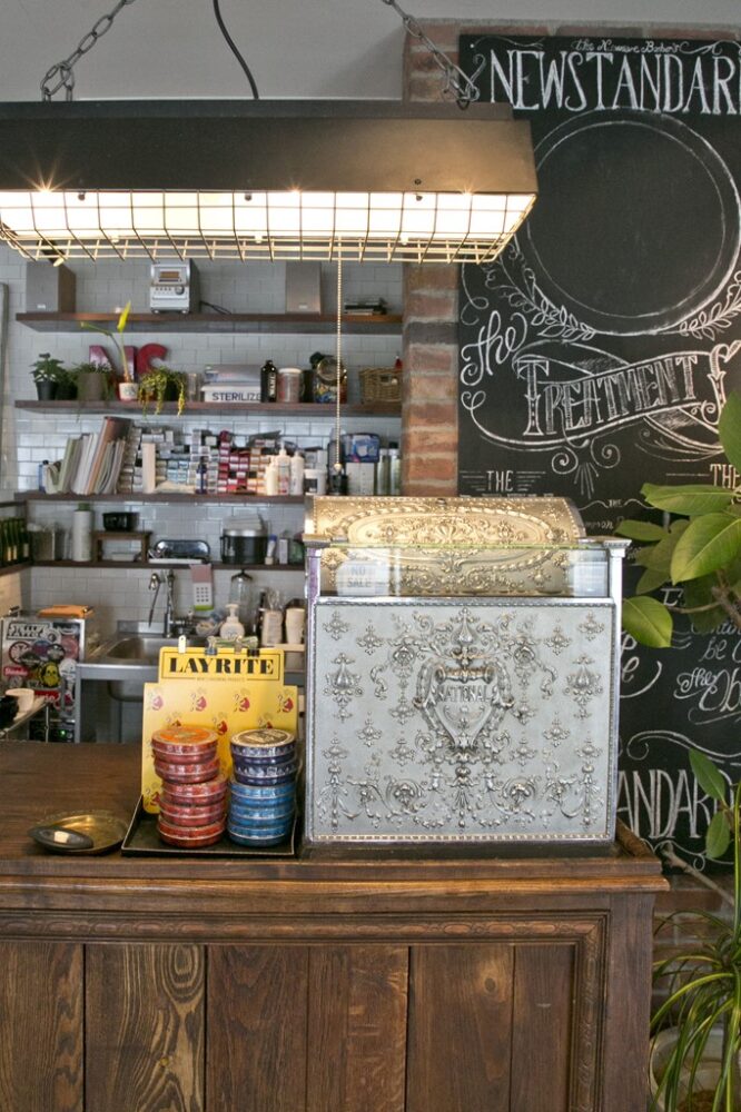 1940年代製のNATIONALのレジスター。レジとして現役で使用している。レジ上の照明は現行品だが、実際のアンティークと合わせて使用することで世界観を盛り上げる。