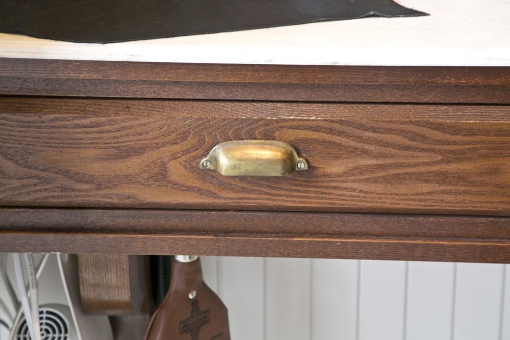 鏡台は新品の木材を使用するが、アンティークフィニッシュを施した後に真鍮製の取っ手を装着。マイナスネジを使っているのも旧く見せるテクニック。