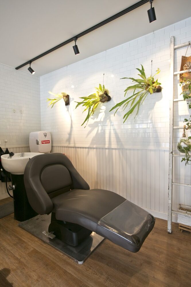 店内奥のシャンプー&ヘッドマッサージスペースは壁面を木材プラスタイルにすることでアメリカンバーバー風をイメージしている。