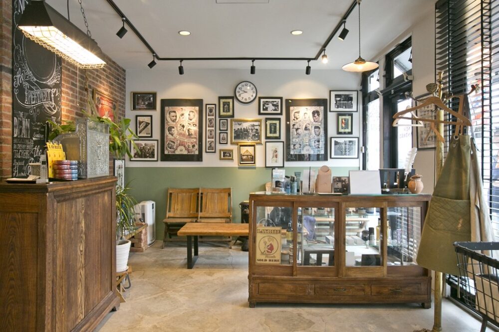 オープンは2014年。それまで町の理髪店で腕を磨いてきたオーナーの下川健次氏はいつか独立した時のためにと、キャビネットやキャッシャーといったインテリアのアイテムを、理髪店勤務時代からコツコツ買ってストックしていたのだという。