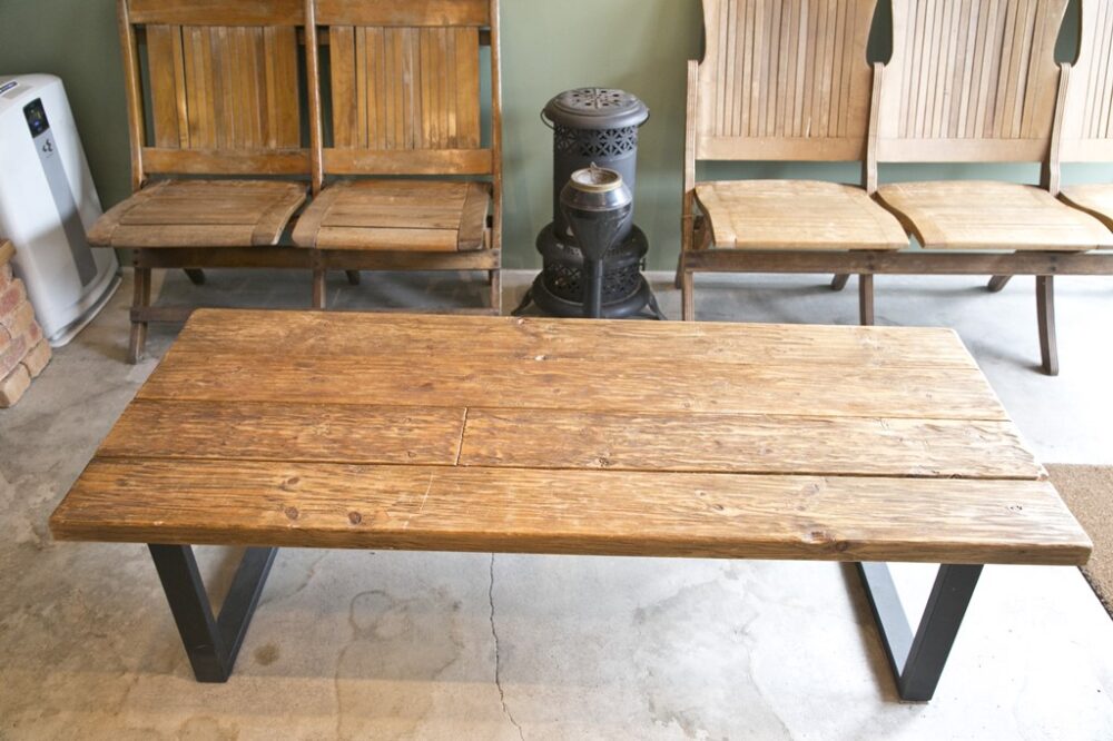 待合スペースに置かれたアンティークのチャーチベンチ。テーブルも同じような質感にアンティークかと思いきや、こちらは自ら作ってアンティーク加工を施したDIY品。
