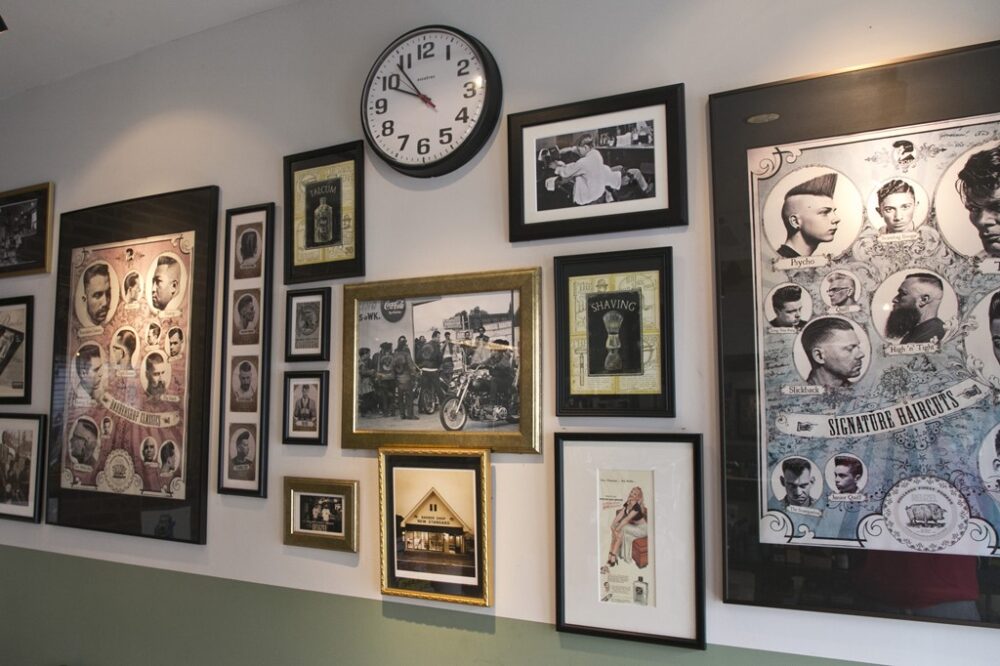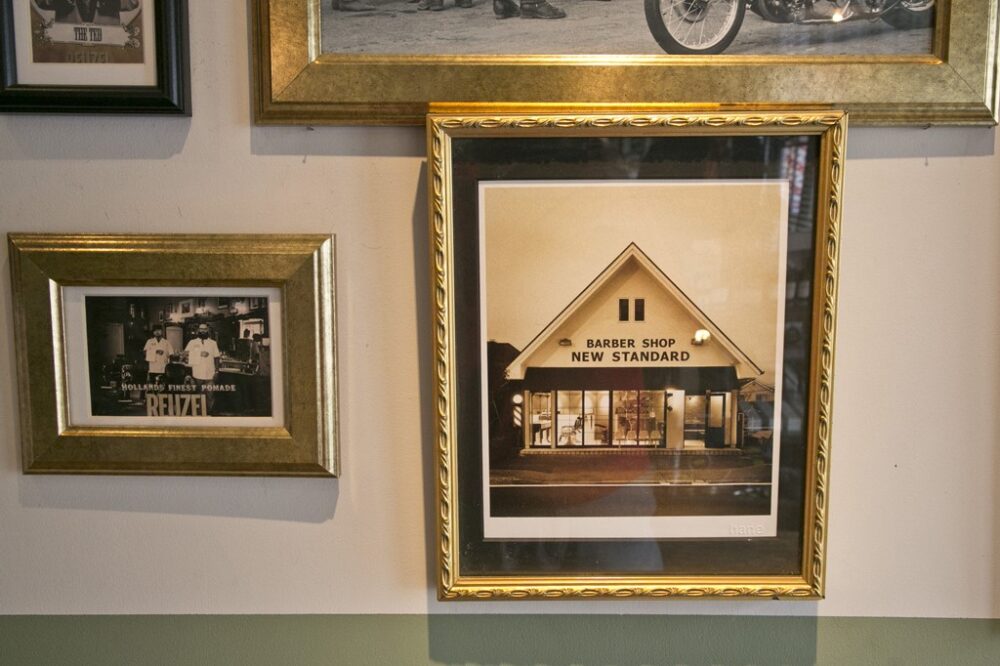 待合スペースの壁面には、バーバーのポスターやアーリーアメリカンな写真に混ざって、友人のカメラマンが撮影した店舗の写真も。額装することで印象も大きく変わる。
