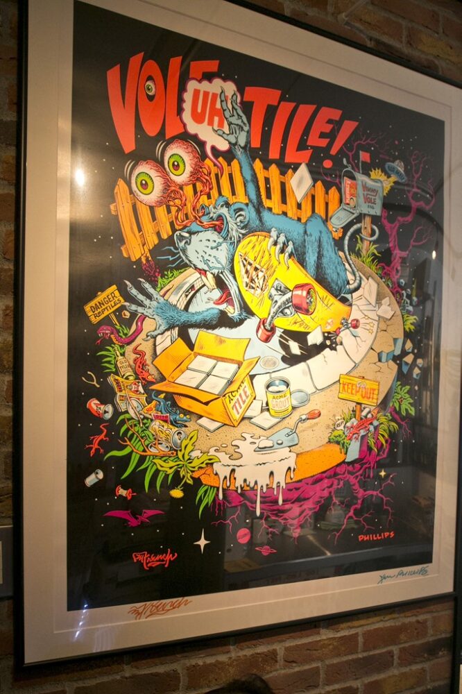 バックヤード入り口に掛けられたVOLCOMなどのイラストを手掛けてきたジム・フィリップスのサイン入りポスター。