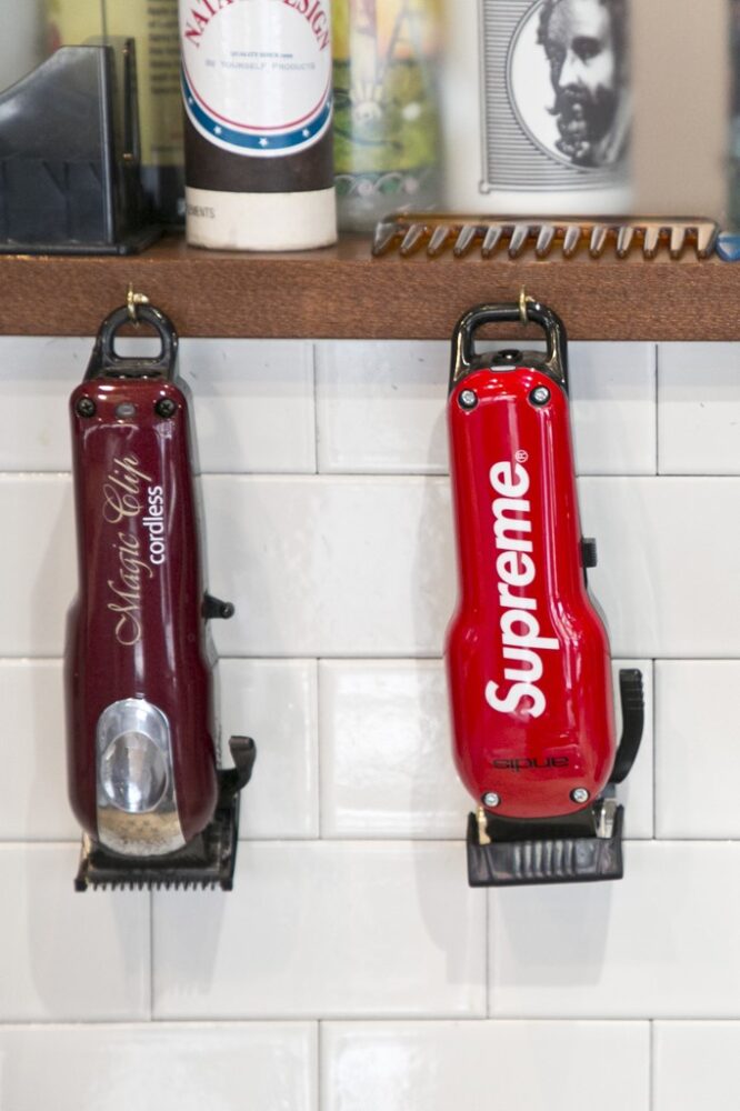 そして、独立時にはアメリカのバーバーを巡って本場のクラシックなバーバースタイルを肌で感じ取り、店舗づくりを研究する旅行も敢行。デザイナーを入れず、自らが店舗のデザインにも関わるなど、理想の世界観を作り上げている。表のアメリカンなサインポール、キャッシャーや待ち合いスペースのチャーチベンチなど基本はアメリカ製のアンティークをメインに使用。