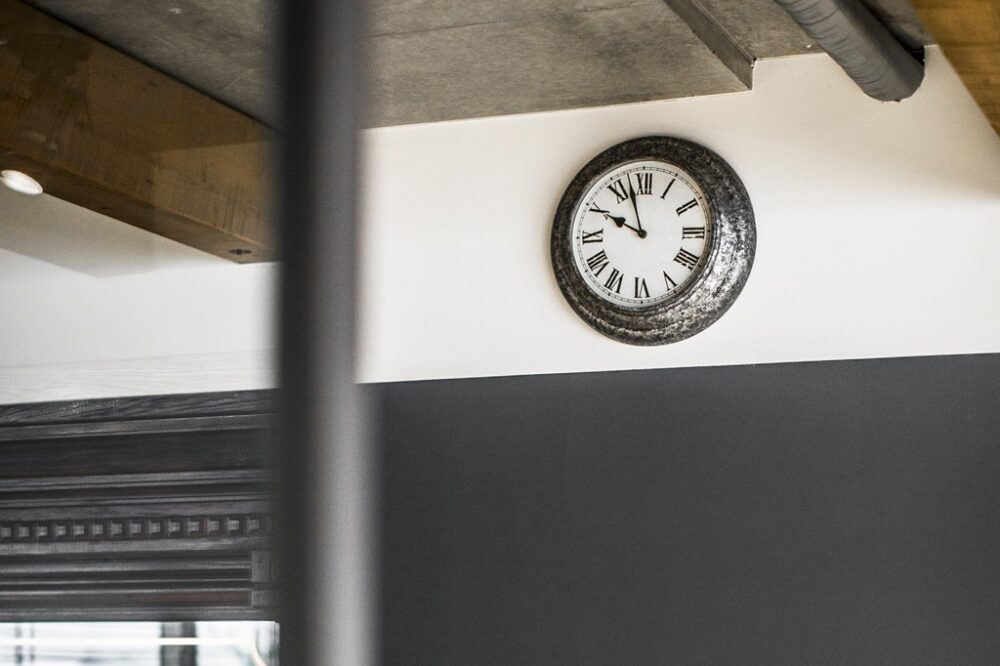 シンプルなウォールクロックは、メタル部分に味が出ており、全体の雰囲気によく似合っていた。白と黒を基調としたカラーリングが随所に配されている。