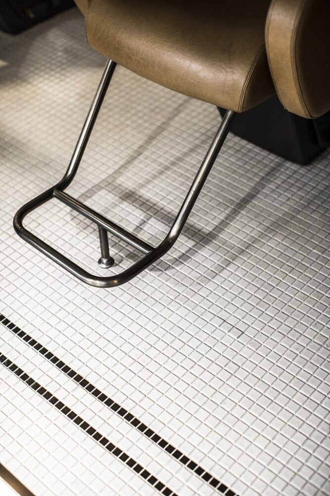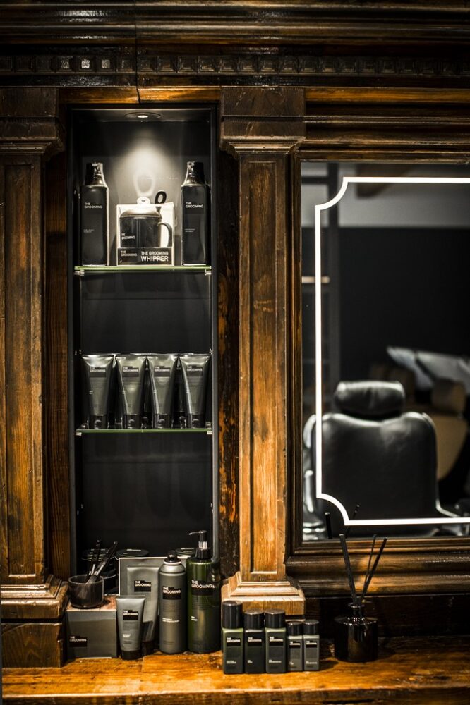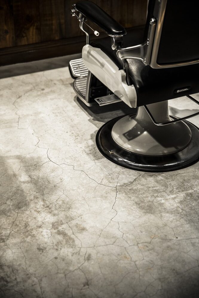 特に圧巻なのが、バーバーチェアの前にあるカウンター。この什器は、脚などの一部に実際のヴィンテージを使い、その風合いに合わせてワンオフで作ったもの。男らしさやクラシックさを醸し出しながらも、モダンに仕上がっているのは、こういう細かなテクニックがあってこそ。