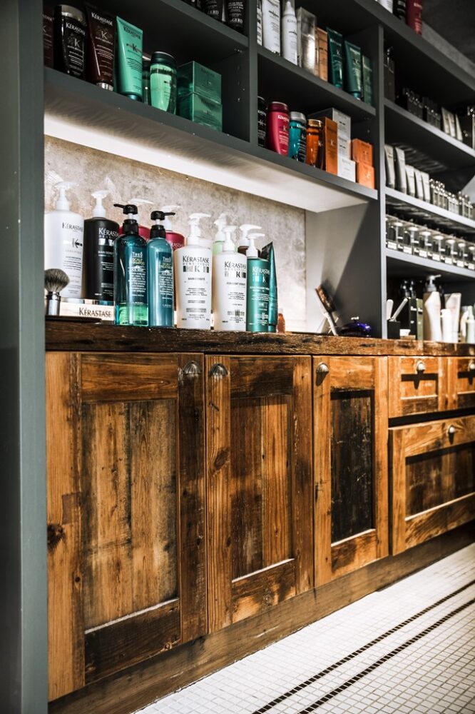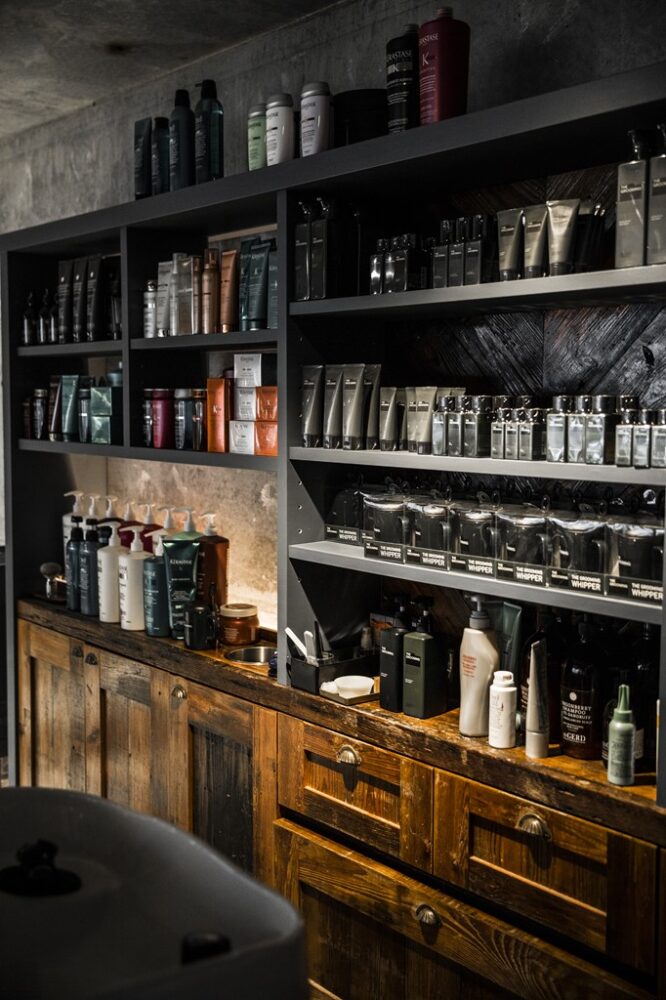 こちらはシャンプースペースに置いてあるオリジナルの什器。ここにはシャンプーやスタイリング剤などがディスプレイされており、絵になっていた。