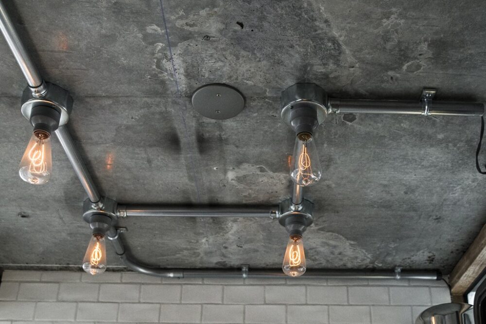 随所に使われているエジソンランプは、インダストリアルファニチャー好きであれば、定番となっている。サインポールをモノトーンカラーにするなど、無骨さとスタイリッシュを兼ね備えている。