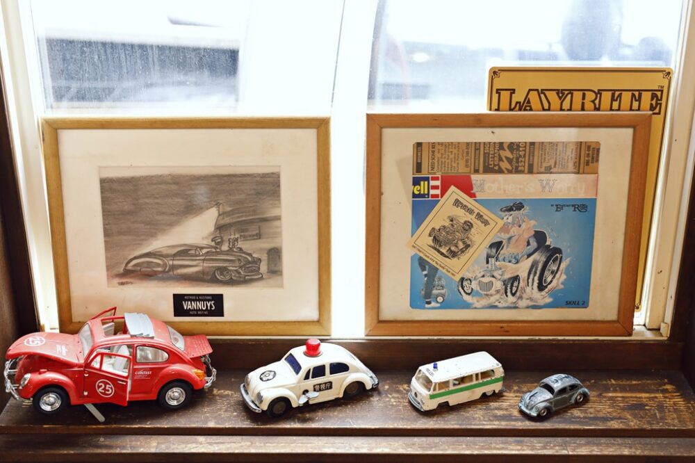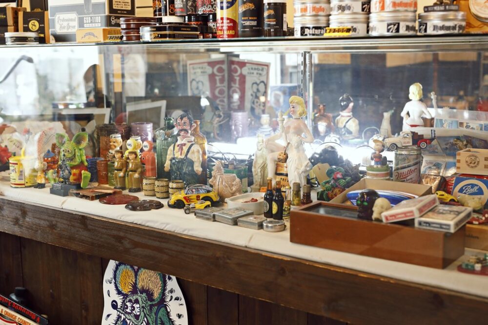 カウンターの棚の中は趣味のフィギアが所狭しと並ぶショーウインドー。ラットフィンク物をはじめ、新旧問わずアメリカのおもちゃのコレクションがディスプレイされている。