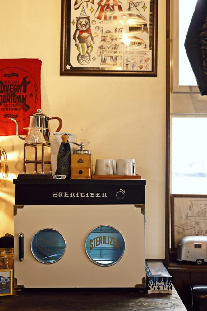 紫外線でハサミやレザーなどを消毒するSTERILIZER製のヴィンテージの消毒器。おそらく’70sだと思われるが、現役で活躍中。シンプルなデザインがインテリアとしても◎。