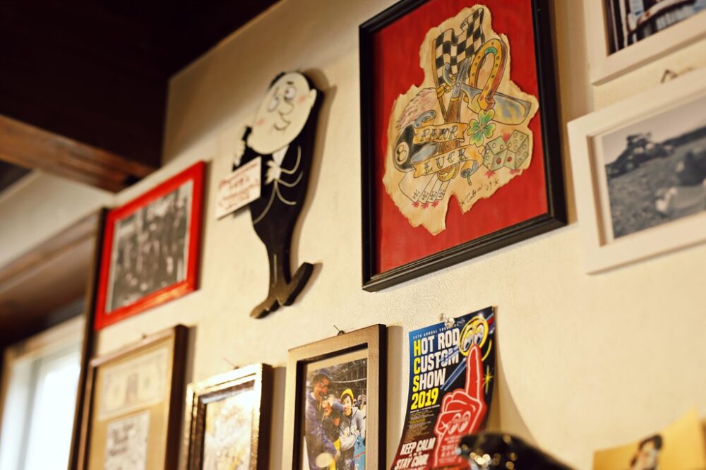 チェッカーフラッグ柄のフロアに加え、ウッドを多用した内装はクラシカルながらも暖かみを感じる空間。壁には趣味に纏わるイラストやポスター、仲間との写真が飾られている。
