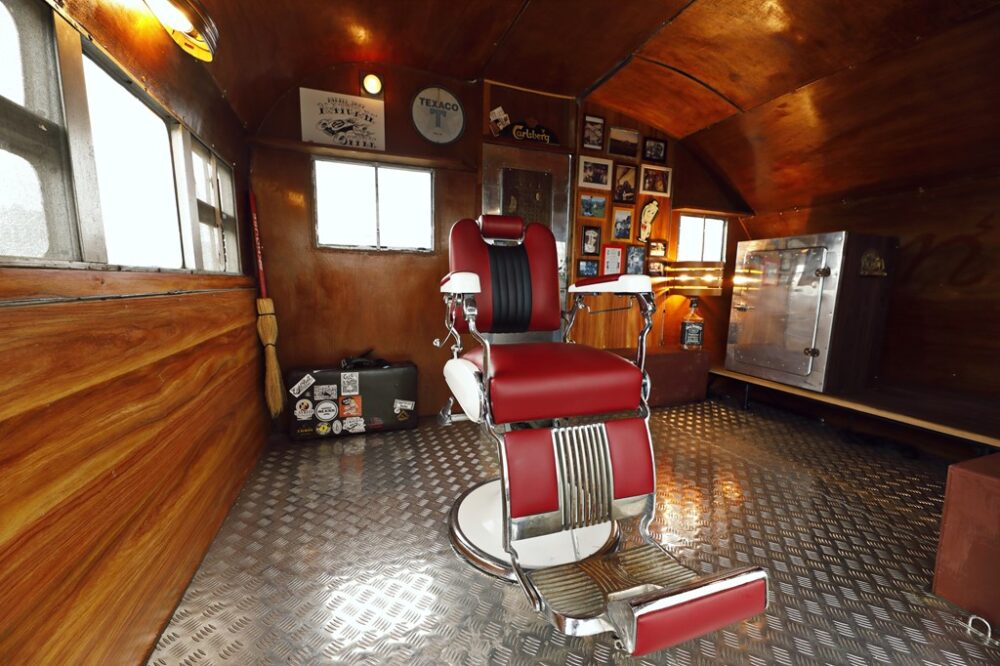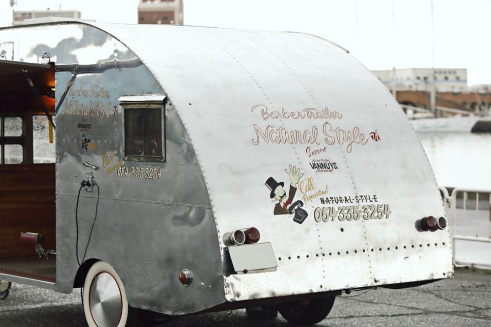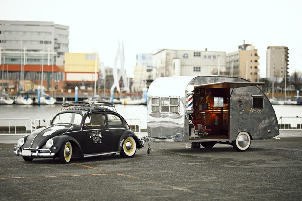 アルミトレーラーの中はバーバーチェアを固定したカットスペース。発電機を使用してどこでも電気が点くようになっており、イベント出店時のパフォーマンスだけでなく、家族で遊びに行く時はこたつを設置したこともあるとか。タイプ1はトレーラーを牽引するためにエンジンを1775ccにスープアップしている。