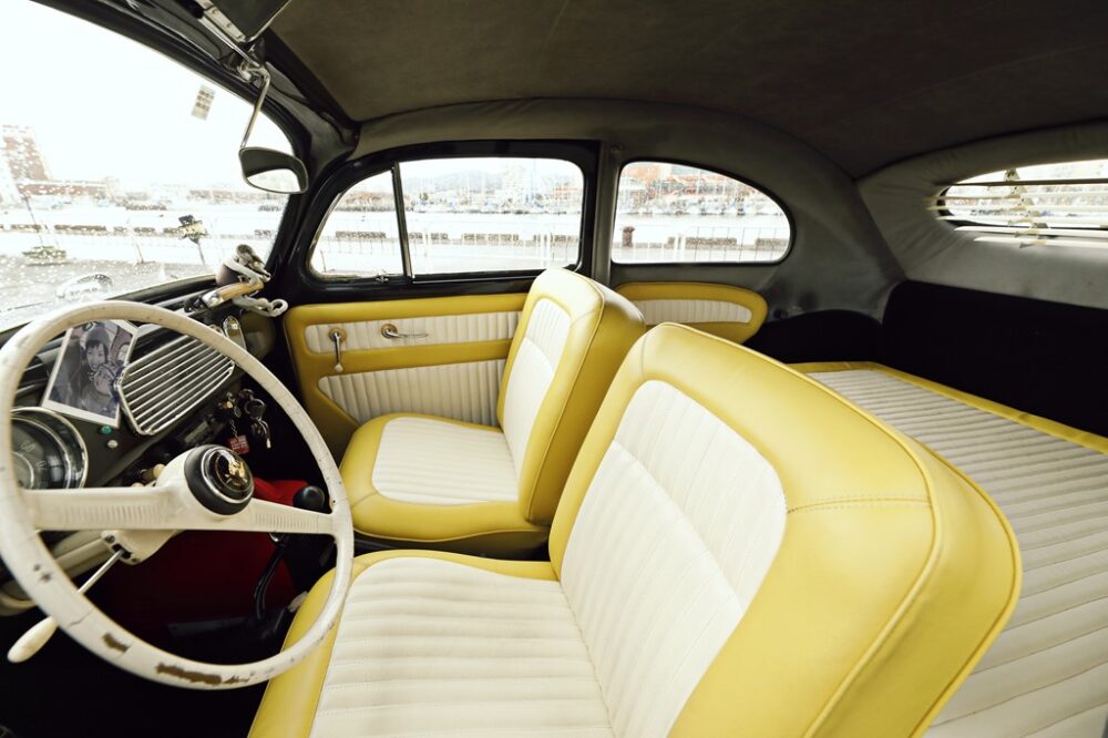 内装のシートは足周りと合わせて黄色と白のレザーで統一している。