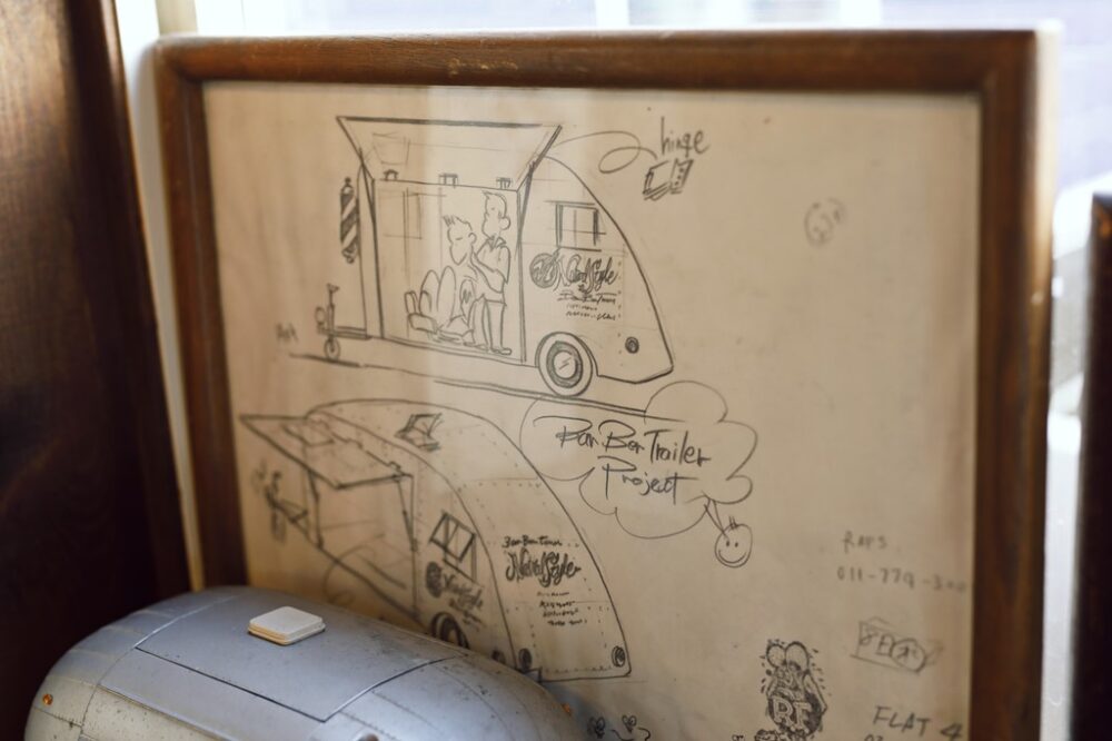 5年前にアルミトレーラーのバーバーカスタムをVANNNUYS AUTOMOTIVEに相談した際にAKIRA氏が描いたラフスケッチ。記念に今でも額装して店内にディスプレイされている。