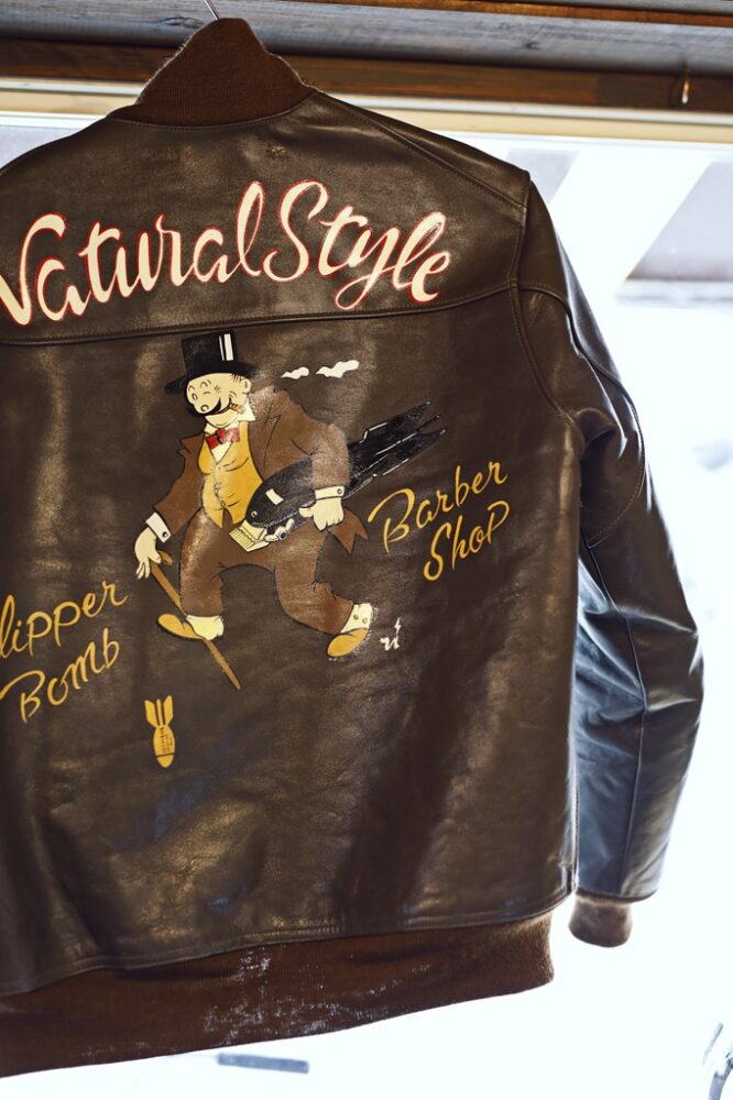 秋冬のアウターとして重宝しているA-1のバックにもAKIRA氏のグラフィックをドロウ。手にクリッパーを抱えたノーズアートをモチーフしたオリジナルデザインだ。