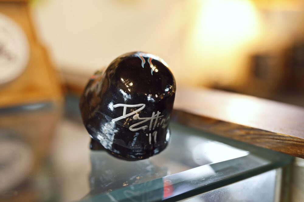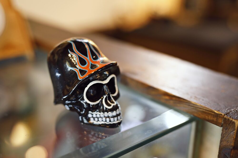 ダン・コリンズが製作したスカルのオブジェ。AKIRA氏から譲り受けた物だが、’19年のホットロッドカスタムショーでダン・コリンズに直接サインを描いてもらったとか。